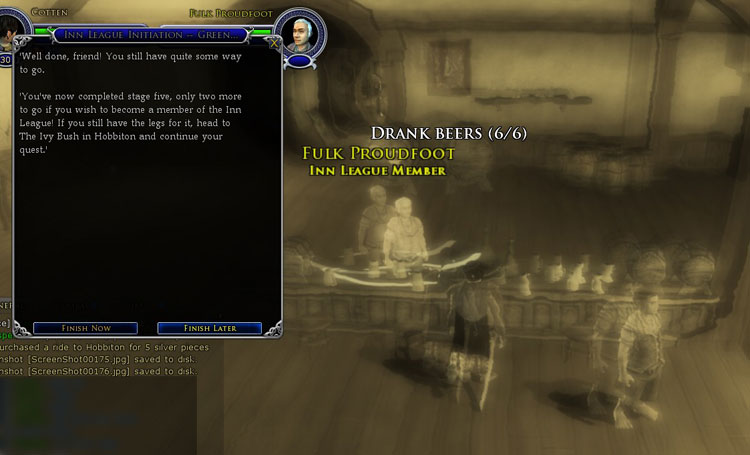 But the developers of LOTRO don’t let booze just sit there, idle. A few times a year, they pick up and the ball, declare a few simple rules, and start tossing it around. At the various yearly festivals—like the Spring Festival and the Harvest Festival—they offer a pub-crawl game which is a trivial quest chain with the goal of traveling to pubs around the Shire and consuming ridiculous amounts of alcohol. Of a half-dozen beers laid out on the table, only about half of them count towards your drinking total, and you’re drinking against the clock; the challenge becomes pixel-hunting against the constraint of a washed-out, wobbling screen, getting worse with each new pub. It’s stupid and surprisingly challenging and surprisingly fun.